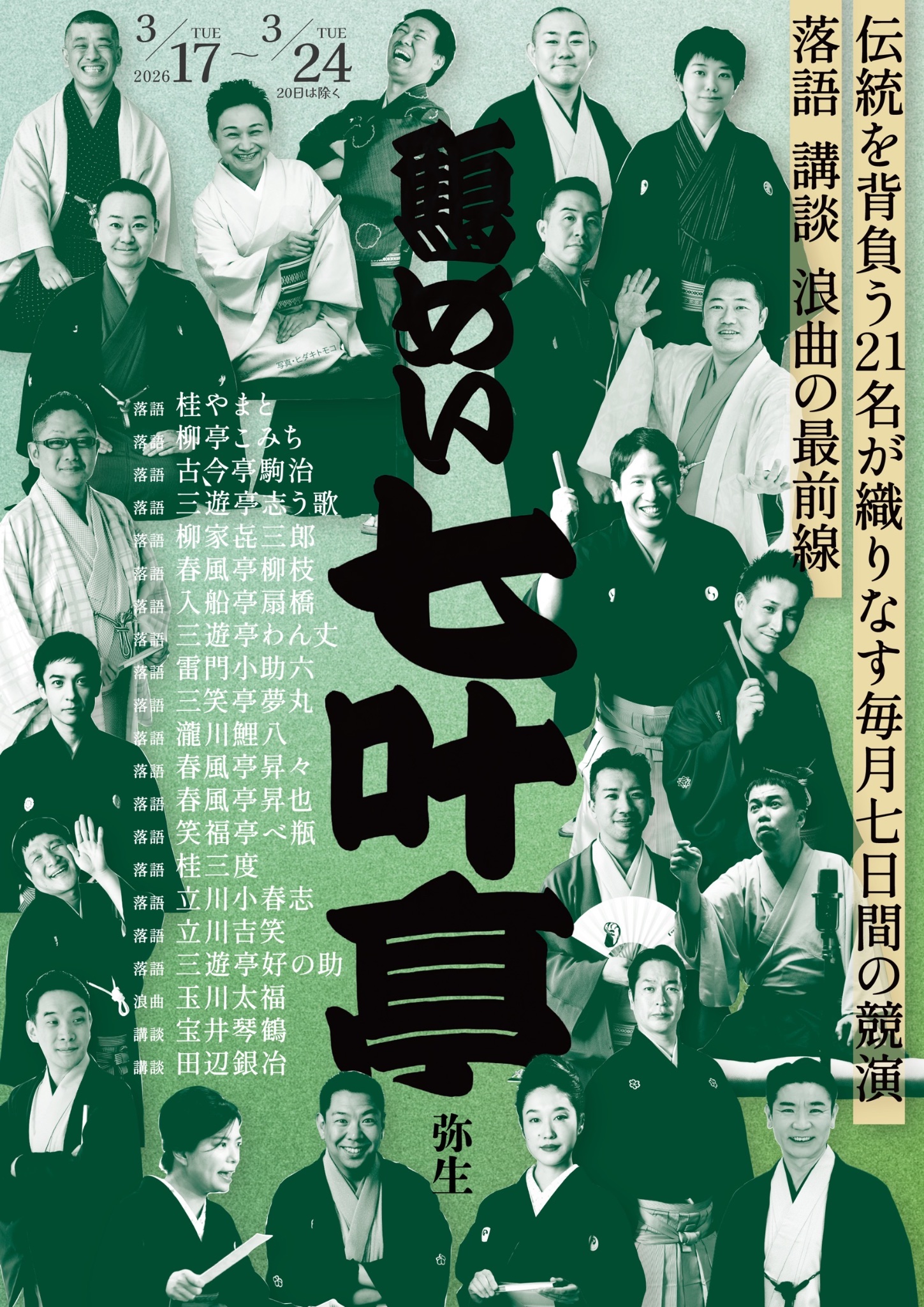 - (交互)馬吉/馬太郎/小駒、アサダ二世、(交互)はな平/たけ平、志ん輔、あずみ、(交互)扇橋/柳枝(18:15上り)、きく麿〈仲入り〉風藤松原、一朝、猫八、主任:今松